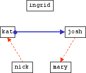 Works with Mary, is friends with Mary and Josh, is acquainted with Kat, and has physically met everyone except Nick
